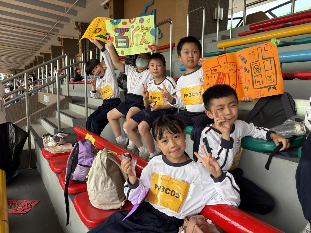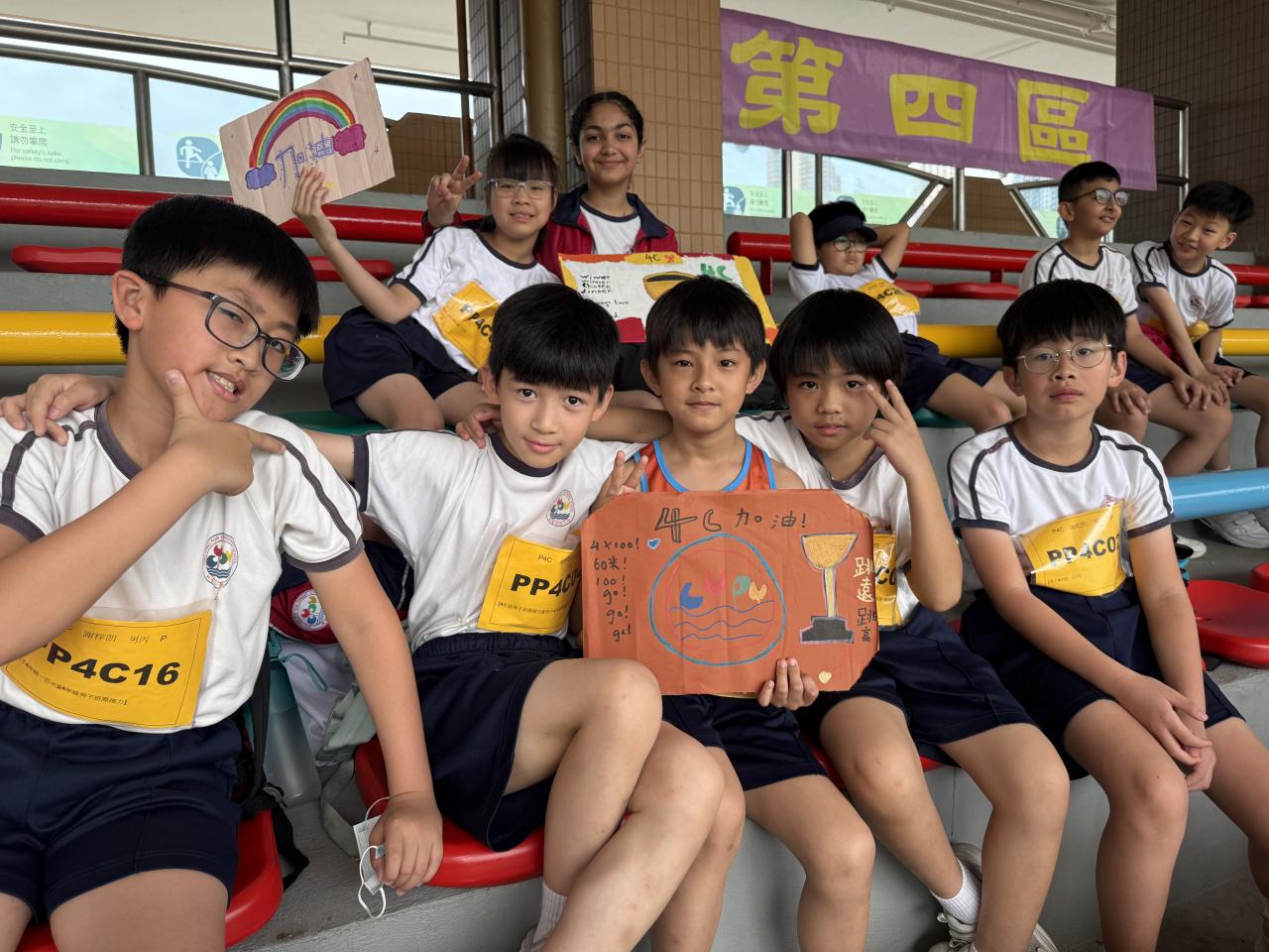 各班同學組成聯校陸運會啦啦隊,齊心協力設計打氣牌,展現團結精神,為運動員加油打氣,營造熱烈氛圍。