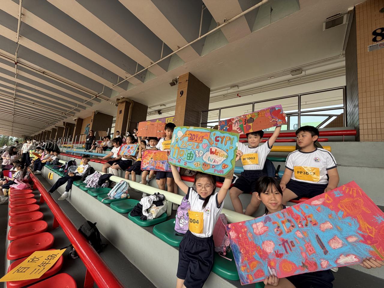 各班同學組成聯校陸運會啦啦隊,齊心協力設計打氣牌,展現團結精神,為運動員加油打氣,營造熱烈氛圍。